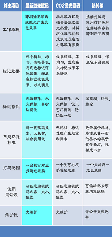 HANS600D柔性包裝激光賦碼系統采用HANS600S激光打標機,對比柔性包裝目前其他常用的賦碼工藝,HANS600S激光賦碼在各方面均具有優勢: