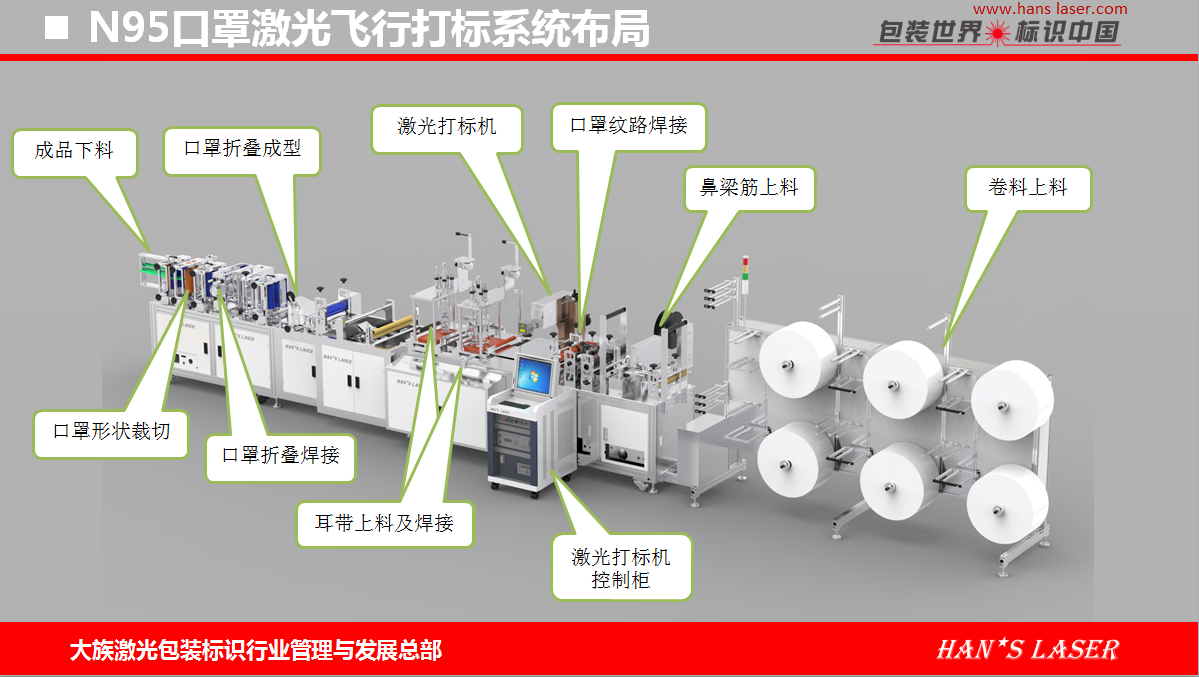 由大族激光推出的N95口罩激光飛行打標系統(tǒng),從上料、標記、折疊、裁剪、最后到成品下料,整個過程可實現(xiàn)N95口罩自動化生產(chǎn),只需要在將成品打包包裝即可。
