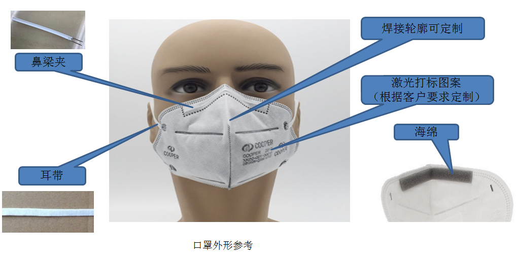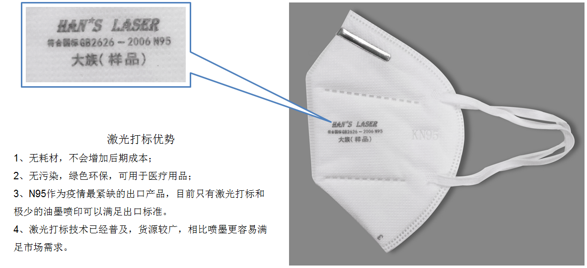 N95口罩機可滿足客戶出口標準,激光打標機所標記的批準(TC)號、NIOSH標記、 N95字樣不可磨滅、無污染,具有綠色環(huán)保、防偽的特征。