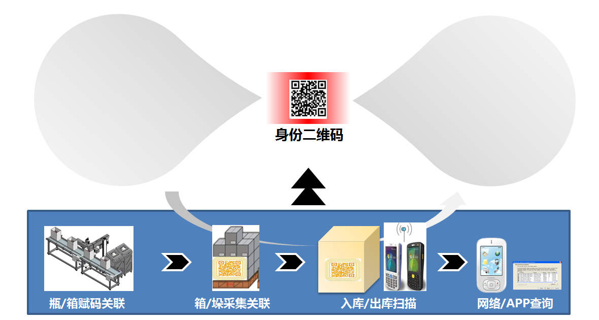 在產品的各級包裝附著物流碼條碼信息,在生產的過程中,為物流碼賦予產品的生產數據(如生產日期、產品批號、有效期、使用的原料次等),并建立產品包裝各級包裝之間的關聯關系,生產結束后將關聯關系上傳到企業數據控制中心,實現一品一碼,也是系統實現防偽功能的數據基礎。